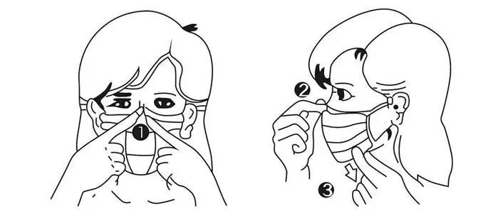 1.确认口罩上下及内外(鼻夹边向上,深色面向外)后,将口罩罩住鼻、口、下巴。