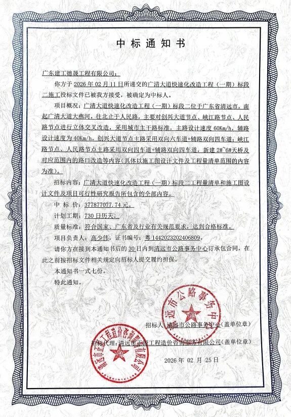 近日,球盟会官网集团下属广东建工球盟会官网工程有限公司成功中标广清大道快速化改造工程(一期)标段二项目,中标金额3.78亿元,顺利实现新年首季“开门红”!