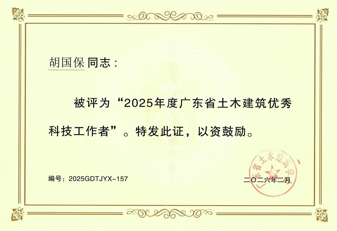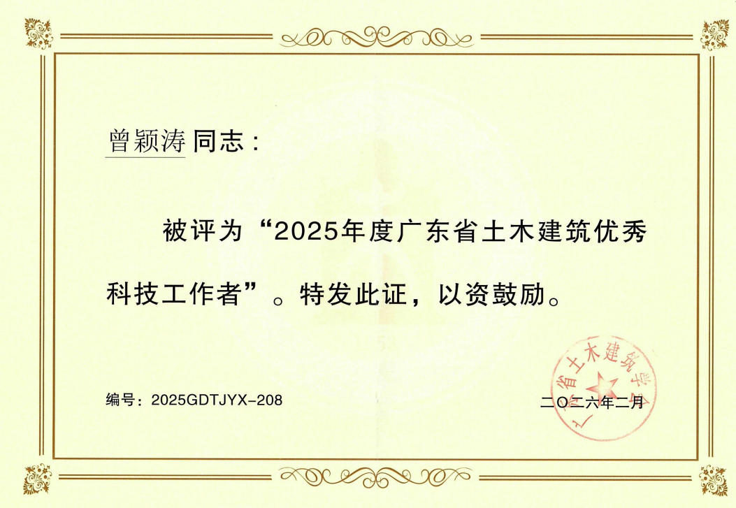近日,广东省土木建筑学会正式表彰2025年度广东省土木建筑优秀科技工作者,球盟会官网集团下属城科集团副总经理曾颖涛、总工程师胡国保凭借在工程行业的深厚专业积淀、突出科技创新成果及显著行业引领贡献,联袂斩获“广东省土木建筑优秀科技工作者”荣誉称号。这份荣誉不仅是对两位同志个人专业能力、创新精神与责任担当的高度认可,更彰显出城科集团在工程领域的战略引领力与科技创新硬实力,是对其整体科技创新布局与实践成果的双重肯定与鼓励。
