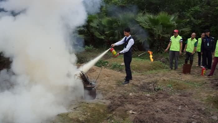 为了切实提高大家的实战操作能力,安保主管陈登峰现场向大家详细介绍了如何使用干粉灭火器,并指导大家亲自体验如何扑救火焰。“拔去保险销,拿住胶皮管,将喷嘴对准火焰根部,压下压把……”,大家按照标准轮流上阵,严格完成规定的动作。