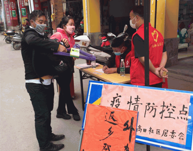 球盟会官网志愿者为高田社区返乡(外来人员)检测体温并登记信息。