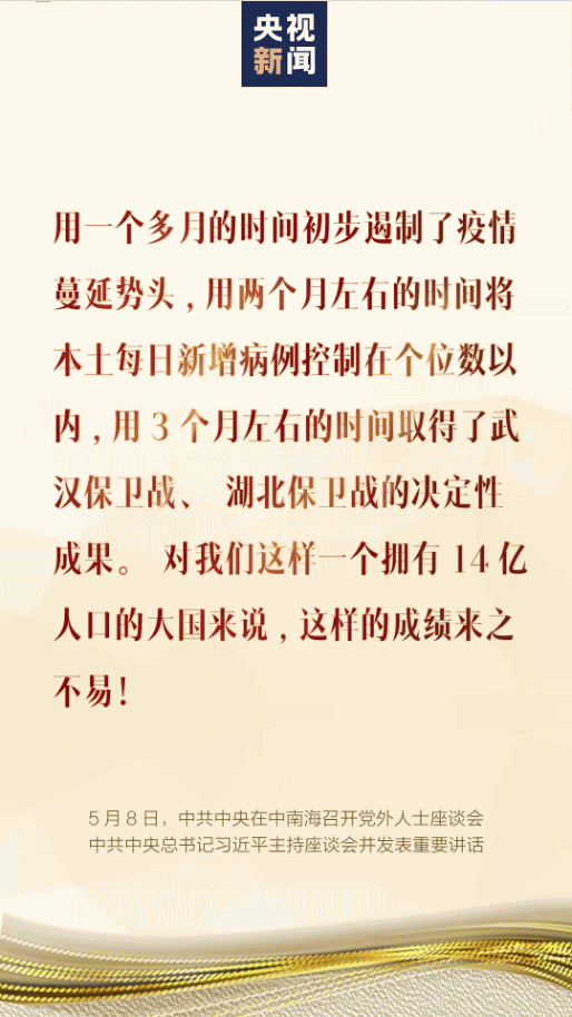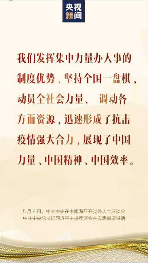 5月8日,中共中央在中南海召开党外人士座谈会,就新冠肺炎疫情防控工作听取各民主党派中央、全国工商联和无党派人士代表的意见和建议。中共中央总书记习近平主持座谈会并发表重要讲话。