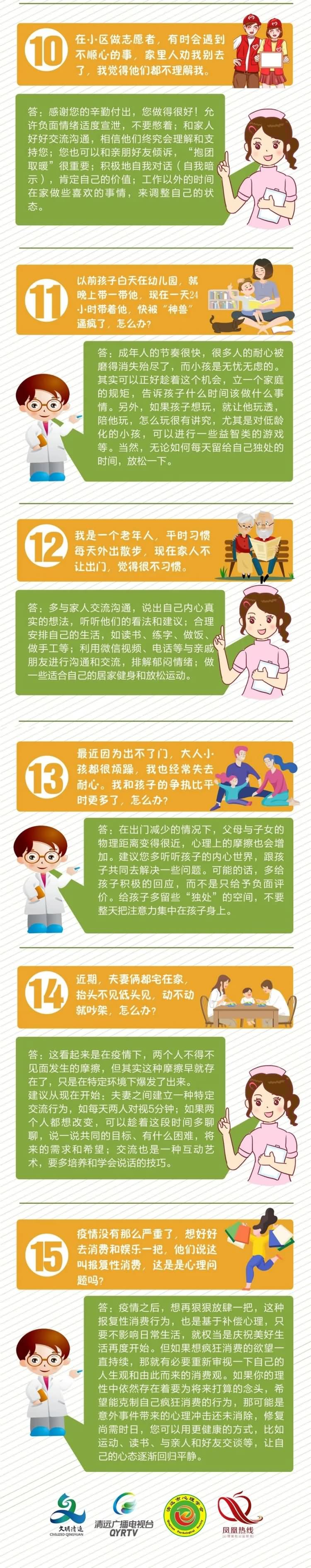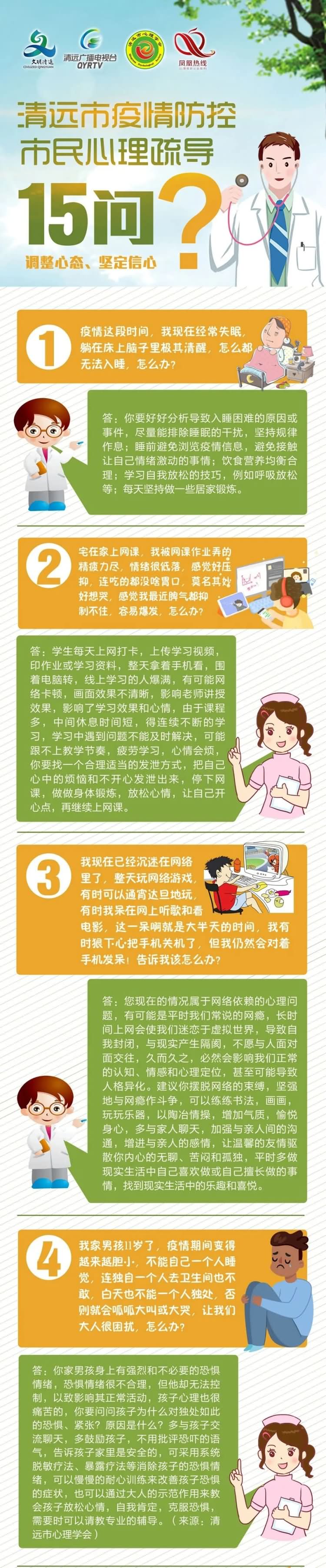 针对在疫情期间接到的清远市民的各类心理咨询,清远市文明办、清远广播电视台、清远市心理学会和清远社工“凤凰热线”心理援助公益服务队整理发布《清远市疫情防控市民心理疏导15问》,引导市民调整心态、坚定信心,更加积极勇敢地面对特殊时期的各种变化,回归正常生活的正确心态。