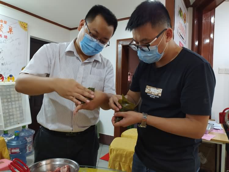北方人喜甜粽,南方人爱咸粽,在手工粽子制作时,大家互相帮助、互相学习,取出2片粽叶卷成漏斗形状,根据自己的口味喜好选择不同馅料,再取粽叶包裹严实,用秸秆紧紧缠绕、绑紧。有的把粽子做成三角形,有的做成长方形、正方形、球形。最后,工作人员把所有完成的粽子一起放在食堂大锅里煮熟,再分回给员工品尝。每组的手工粽子都各具特色,每人的手工粽子都别有风味。