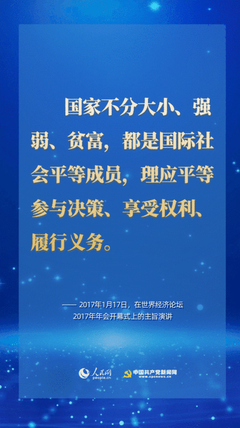 国家不分大小、强弱、贫富,都是国际社会平等成员,理应平等参与决策、享受权利、履行义务。要赋予新兴市场国家和发展中国家更多代表性和发言权。2010年国际货币基金组织份额改革方案已经生效,这一势头应该保持下去。要坚持多边主义,维护多边体制权威性和有效性。要践行承诺、遵守规则,不能按照自己的意愿取舍或选择。