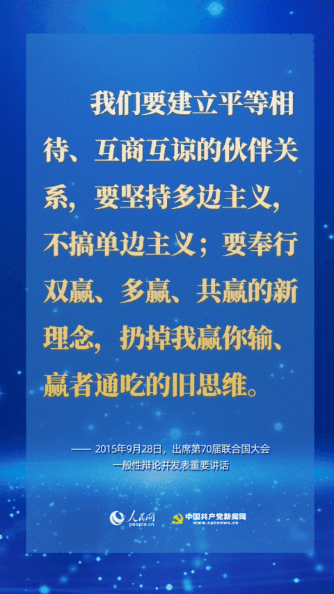 我们要建立平等相待、互商互谅的伙伴关系,要坚持多边主义,不搞单边主义;要奉行双赢、多赢、共赢的新理念,扔掉我赢你输、赢者通吃的旧思维。要倡导以对话解争端、以协商化分歧。要在国际和区域层面建设全球伙伴关系,走出一条“对话而不对抗,结伴而不结盟”的国与国交往新路。大国之间相处,要不冲突、不对抗、相互尊重、合作共赢。大国与小国相处,要平等相待,践行正确义利观,义利相兼,义重于利。