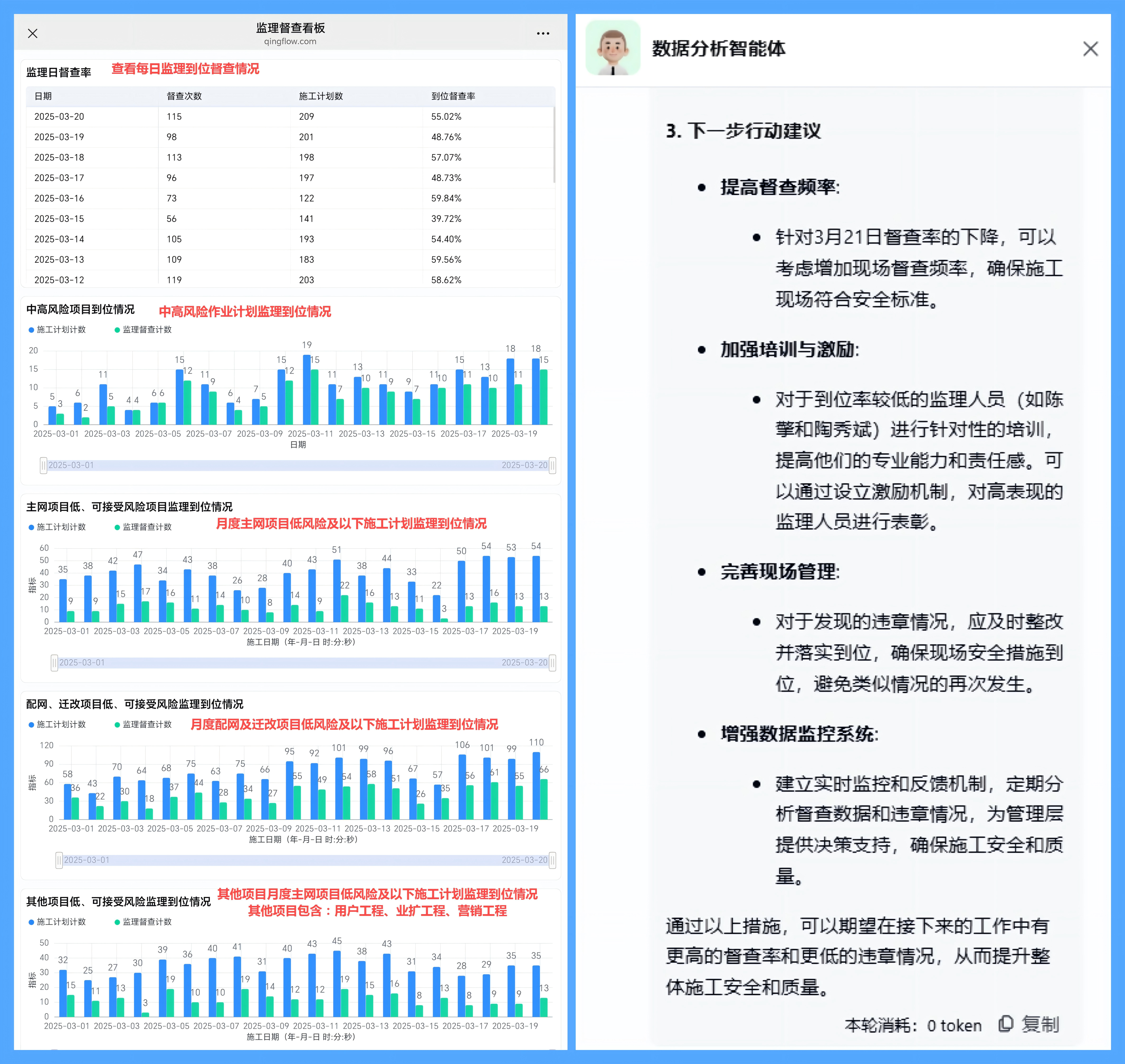 在安全管理方面,诚创公司以“监理行为数字化镜像”为核心,上线监理督查数看板,全面监督监理履职情况。通过系统派工、监理领取任务的形式,促使监理到现场督查打卡,过程行为全留痕,并动态生成“监理日督查率”“中高风险项目覆盖情况”等关键指标,形成可视化的“履职心电图”。