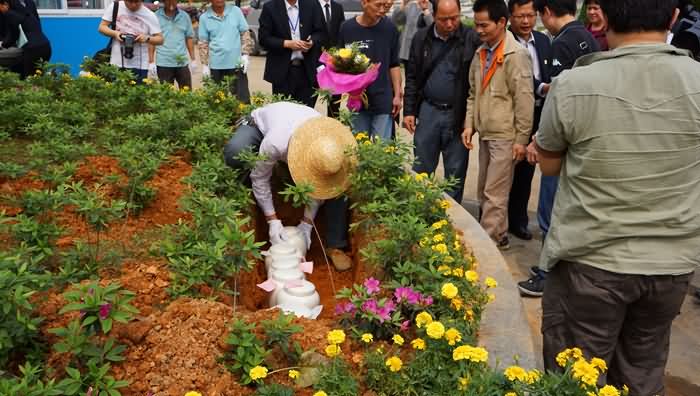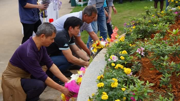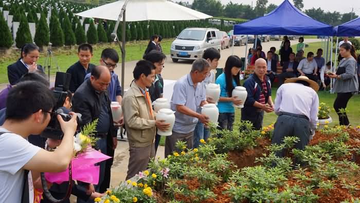 3月21日上午,经过一分钟静默和简单温馨的告别仪式之后,各逝者家属按序轮流护送先人骨灰盒安放到开满菊花的花坛之中。